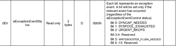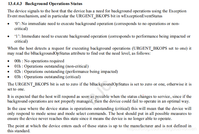 (1) check exception event status after device execption event occur. if it is URGENT_BKOPS, then check bkops status , if bkops status >= 02h(initial bkops status after boot up), then enable fBackgroundOpsEn