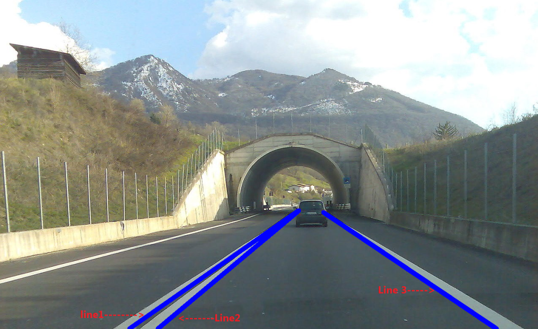 一旦我们从步骤3中获得了直线,在这一步中我们将这些直线分成两组(左边和右边)。如果你注意到步骤3的输出图像,那么该步骤将把Line1和line2放到左边的组中,而Line3放到右边的组中。