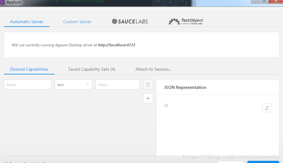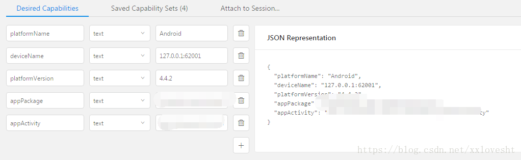 4、在Desired Capabilities 下填写需要获取APP元素的配置。点击Save As保存下来