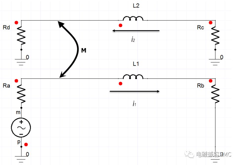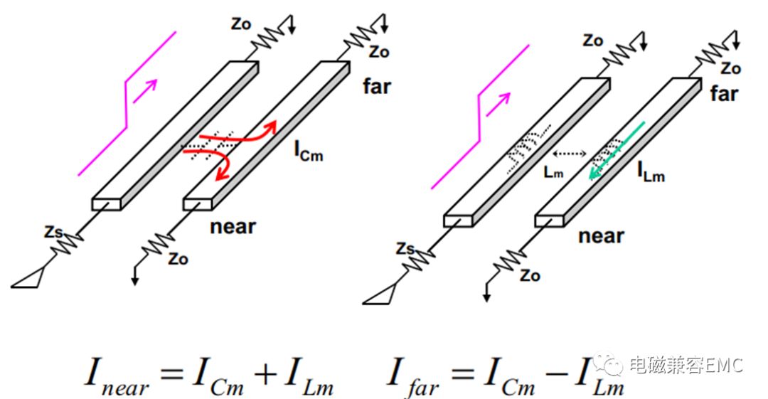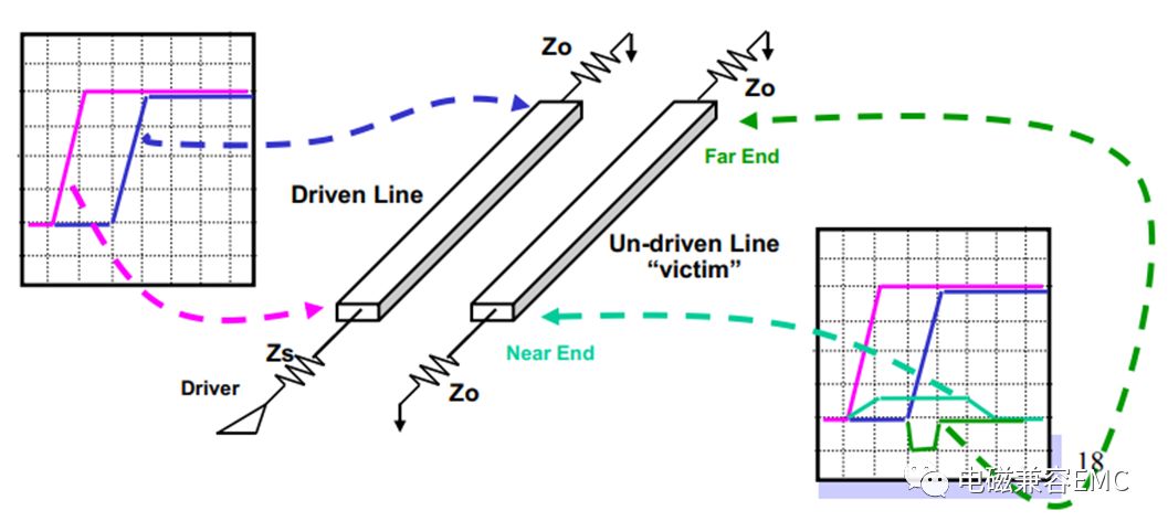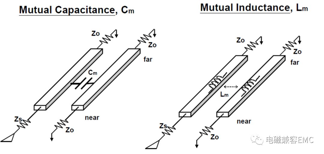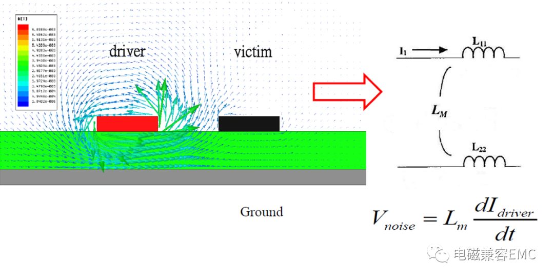 互感通过磁场将噪声电流从一条驱动线引导到相邻的被扰线上,驱动线产生的磁力线穿过被扰线上,行成感应电流。
