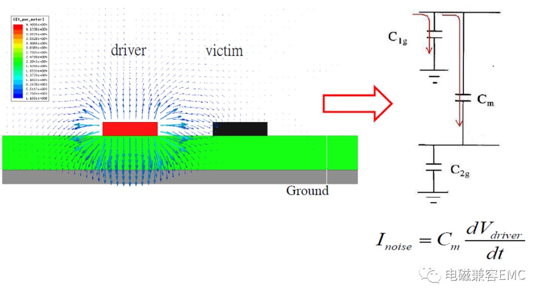 是两导体间通过电场耦合,驱动线上的时变电压信号通过互容在被扰线上引起感应电压。