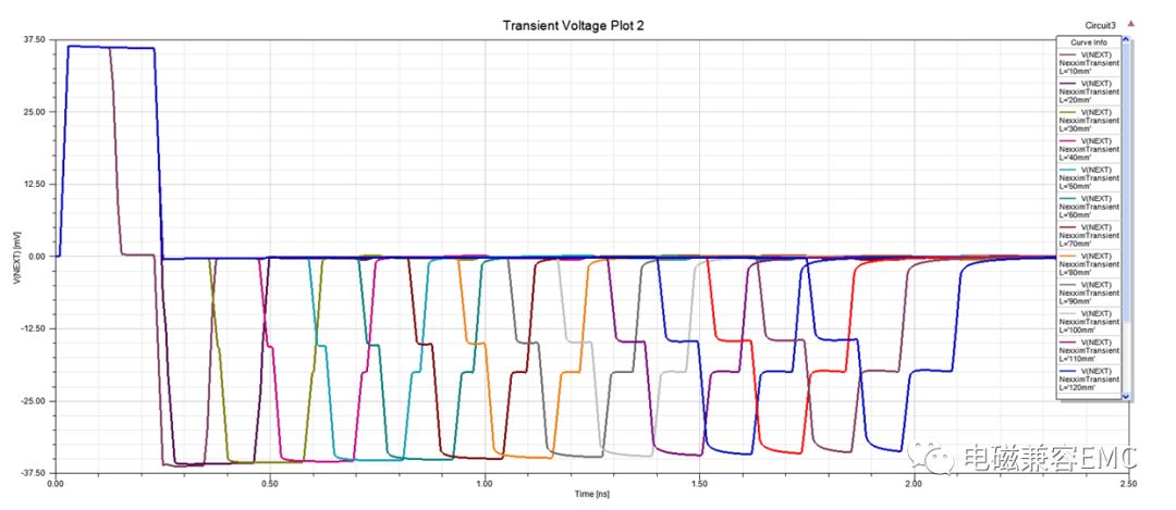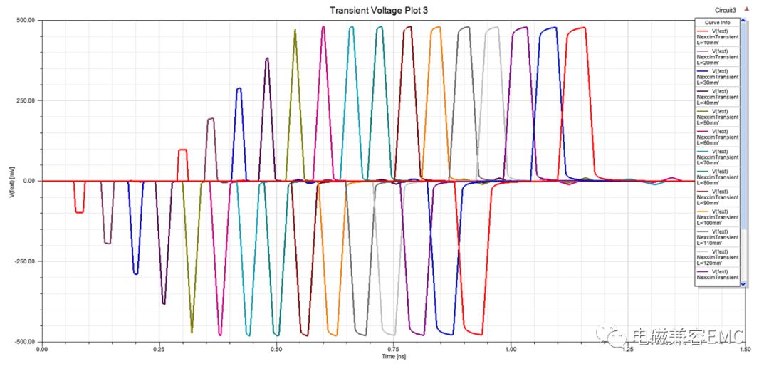 沿用第二节中微带线的参数,其中线间距SP设置为0.25mm,微带线长度设为L,sweepL 10mm~150mm per 10mm,查看三个电压波形。