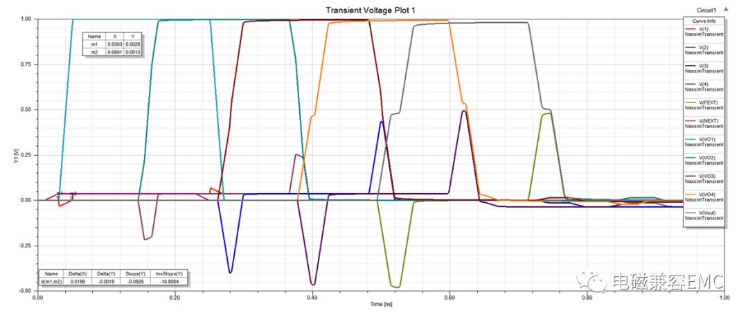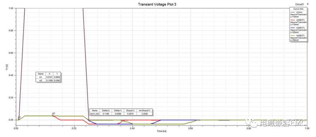 观察FEXT波形,可以看出波形从297ps时开始下降,这时Driver line电压波形刚好开始上升,此时传输线末端为短路,近端是开路,ICM-ILM为负,所以接收到的电压波形为负值,当时间在320ps~520ps时,由于不存在dV/dt,所以没有感应电压产生。当Driver line电压波形下降时,FEXT端接收到相反的dV/dt,所以电压波形为正。