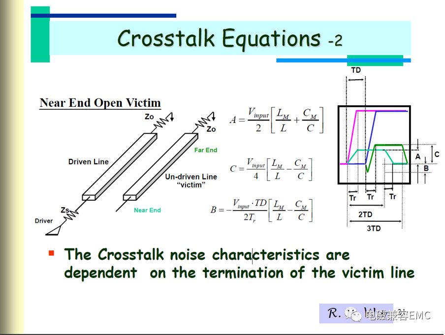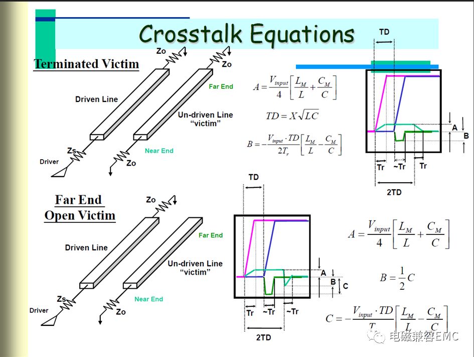 近端和远端耦合电压的描述,下图吴瑞北老师的课件中给出了三种情况下,近端和远端的串扰模型及相应的计算公式。从中可以看出,近端耦合噪声幅值仅与微带线分布参数和驱动电压有关,当耦合微带线截面尺寸和驱动电压电平确定,其幅值便可以确定。而远端耦合噪声的幅值,不仅与微带线分布参数和驱动电压相关,还受时延与驱动波形上升沿时间相关。