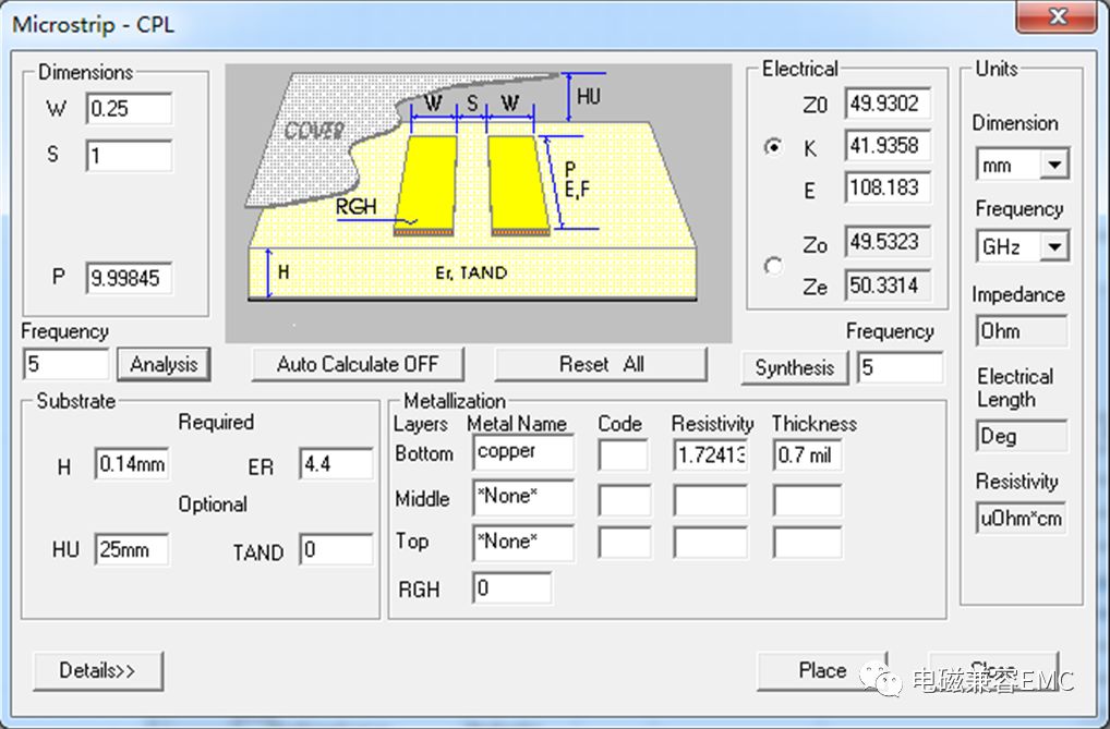 Fig7.特征阻抗为49.93Ω的耦合微带线参数
