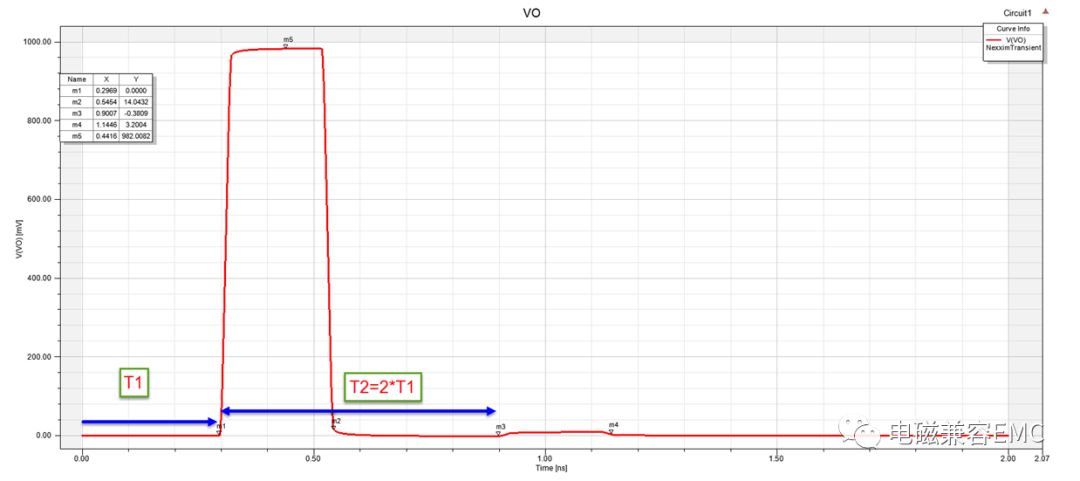 Driver line上驱动信号波形为,电压幅值1V,TR=20ps,TF=20ps,PW=200ps的单脉冲方波。图3为VO端的输出波形,从中可以看出几点,首先传输线产生了18mV的压降。其次,m3-m4间有9.5mV的凸起,这个是脉冲的二次反射,三次以上的反射因为幅值太小已经无法观察到。