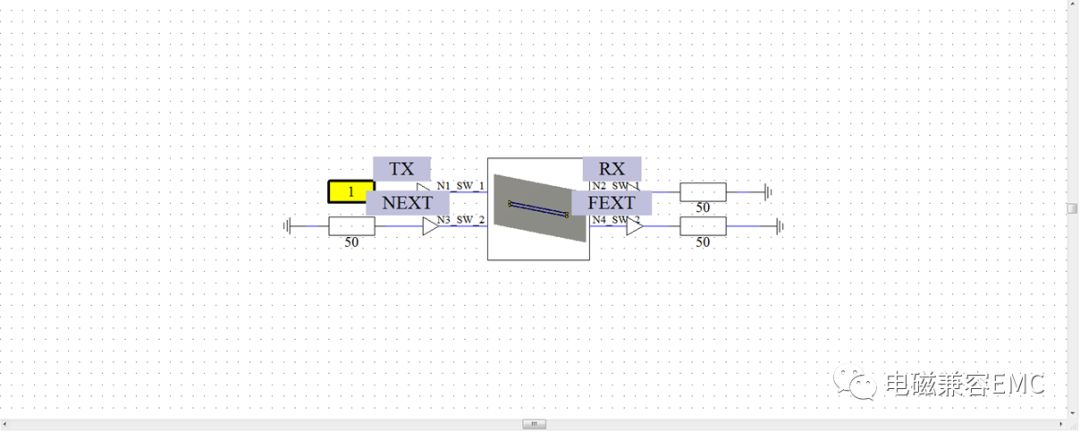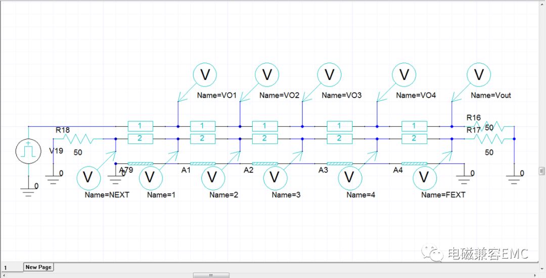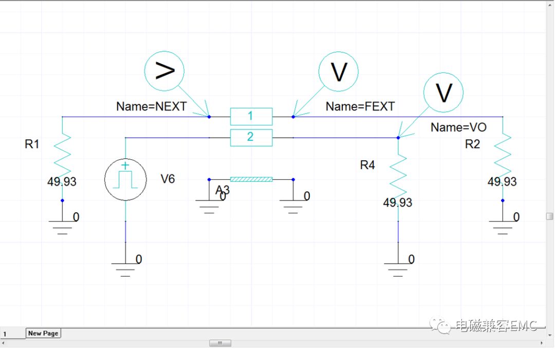 根据前面参数在designer中建立仿真模型,2号微带线为driver line,1号线为victimline,Vo为输出电压,NEXT为近端串扰电压,FEXT为远端串扰电压。