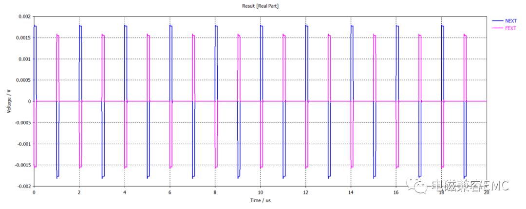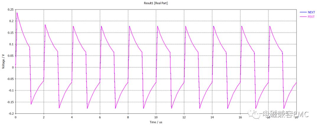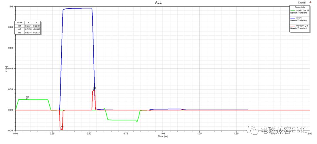 观察NEXT波形,可以看出波形从0s开始上升,这是由于Victim line近端可以第一时间接受到来自Driver line的噪声信号,在这段时间内,波形还未到达传输线末端,认为FEXT端开路,NEXT端为短路,ICM+ILM为正,所以其电压幅值为正。而当过了594ps后,NEXT端迎来了FEXT端传过来的二次反射,这时从FEXT端看进去的情况刚好相反,所以电压波形为负。