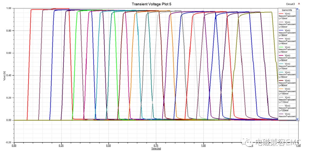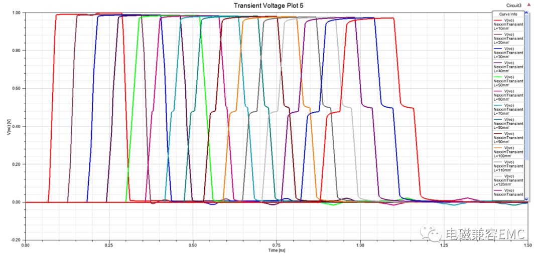 为了找出FEXT随着耦合线增加,其感应pulse的高度却在某长度不再增加的原因,我们观察一下Vo随着耦合线长增加的波形变化,如下图所示,physical length 50mm以上(含)时,Vo的rising/falling在一半高度开始有变化。