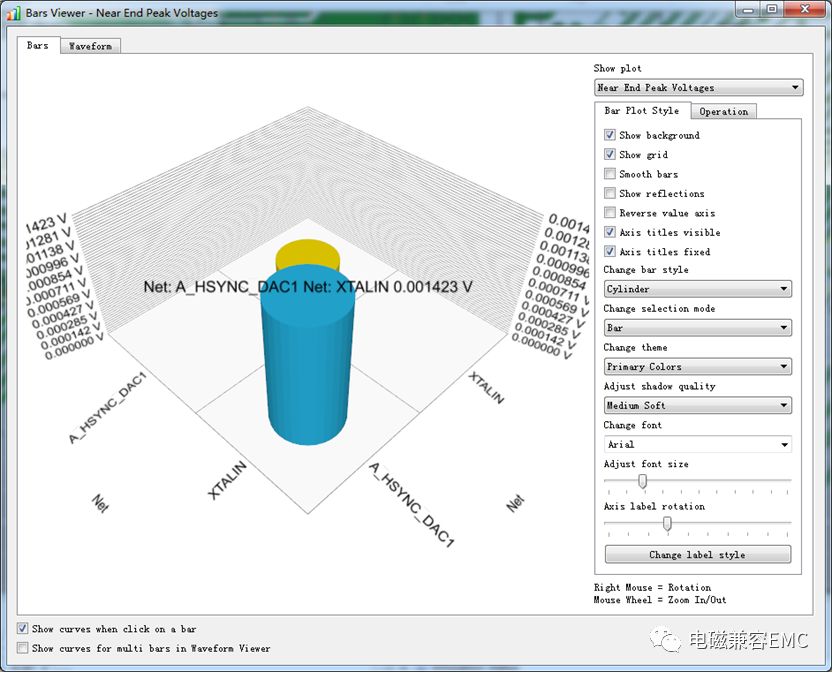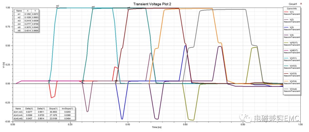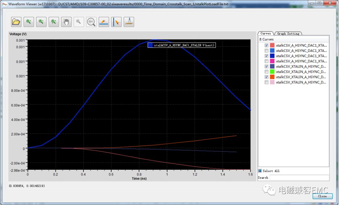 不到半分钟后仿真结束,查看FEXTt和NEXT端各自耦合到的电压波形,如下图所示,从结果可知,A_HSYNC_DAC1在XTALIN线上产生的NEXT耦合噪声最高,约为0.001V。一般信号走线中串扰电平的安全阈值约为信号电平的5%,因此这两根走线在布线上认为是OK的。