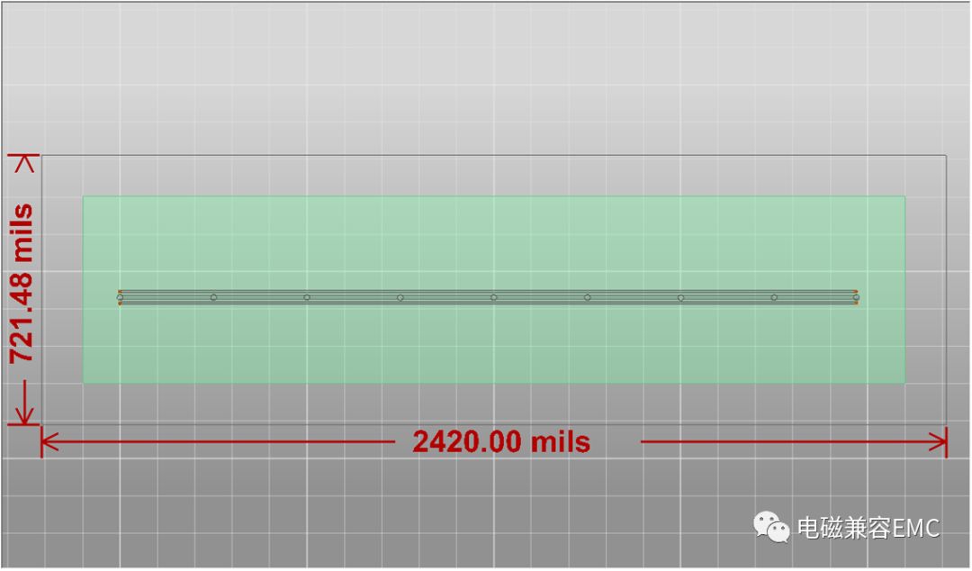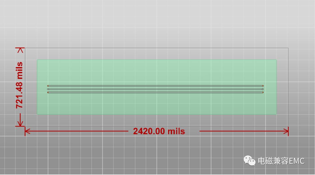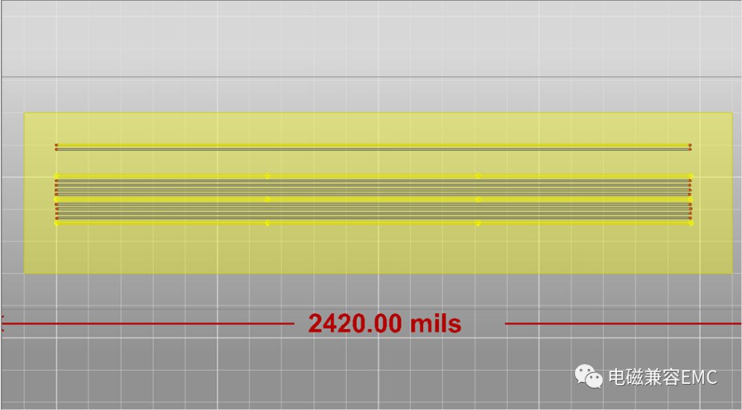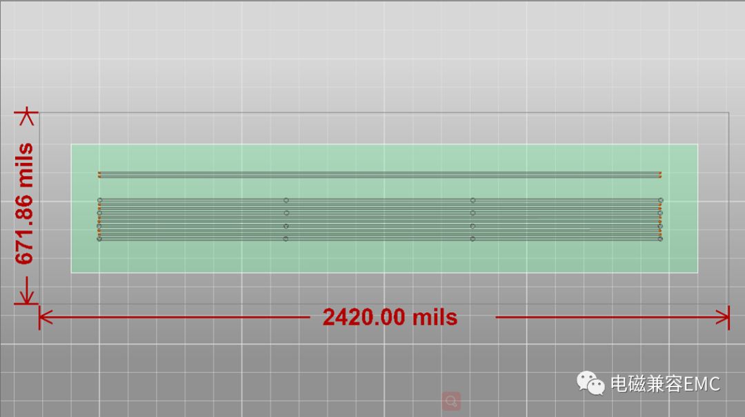 如下图所示,建立特征阻抗为50Ω的微带线模型,线宽为14mil,介质厚度8mil,介电常数4.4,走线长度为1975mil,两根信号线间有一根可变宽度的伴随地线,地线通过两端接地。查看随地线宽度的变化,受扰线上噪声波形的变化情况。伴随地线初始宽度为5mil,每次增加宽度为2mil。
