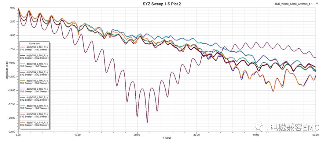 图26中所示模型,走线编号从上到下分别为T01~T09,每条trace的左侧为L端口,右侧为R端口,图27为每条trace的S21参数。