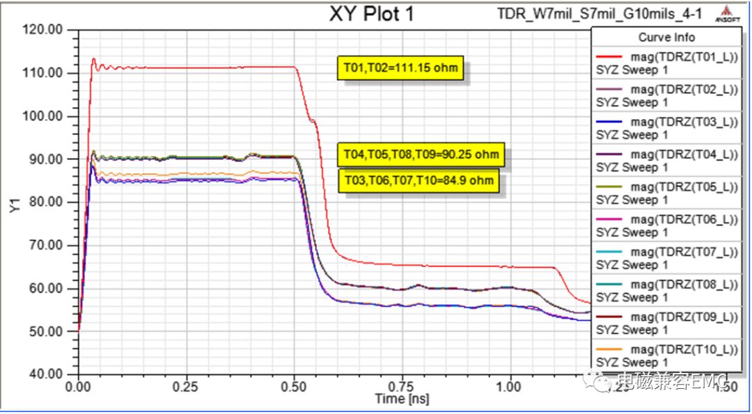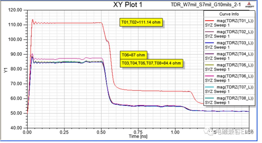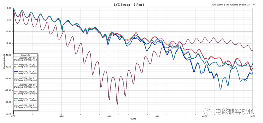 T03~T08是一样的结构,S21应该都差不多,从此例的模拟结果来看,SIwave的精度大概到25GHz,而Ansoft当时给出的官方说法是SIwave适用于DC~50GHz。