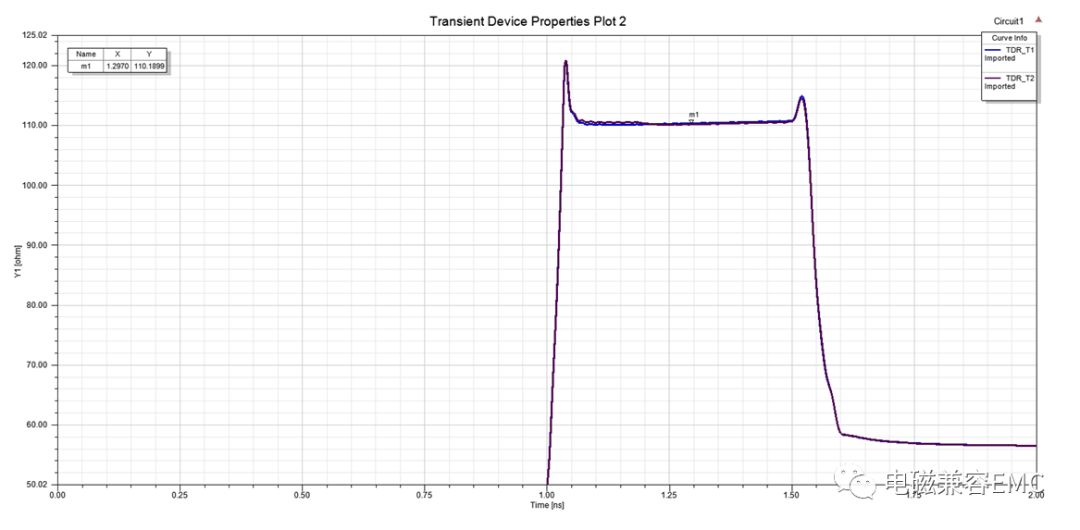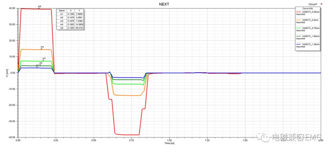 查看3.1节中NEXT端波形情况,可以看出只有当传输线长度为10mm时,电压波形宽度是小于20mm以上情况的。由3.2节可知,传输线时延为5.745ps/mm,当长度为10mm时,耦合波形时间长度为57.45ps。而结果中m1~m2对应的时间为117ps,这是为什么呢?