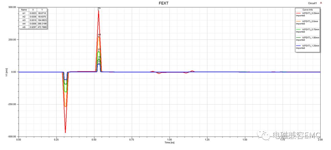 通常我们认为远端串扰宽度与pluse的上升沿和下降沿时间相等,均为Tr不变(20ps),而且随着耦合长度增加,远端串扰的幅值也应该随之增加。但下图中可以看出,随着平行走线超过50mm,FEXT的大小却呈现饱和(476.7mV),并且pluse宽度增加(>20ps),这是为何?