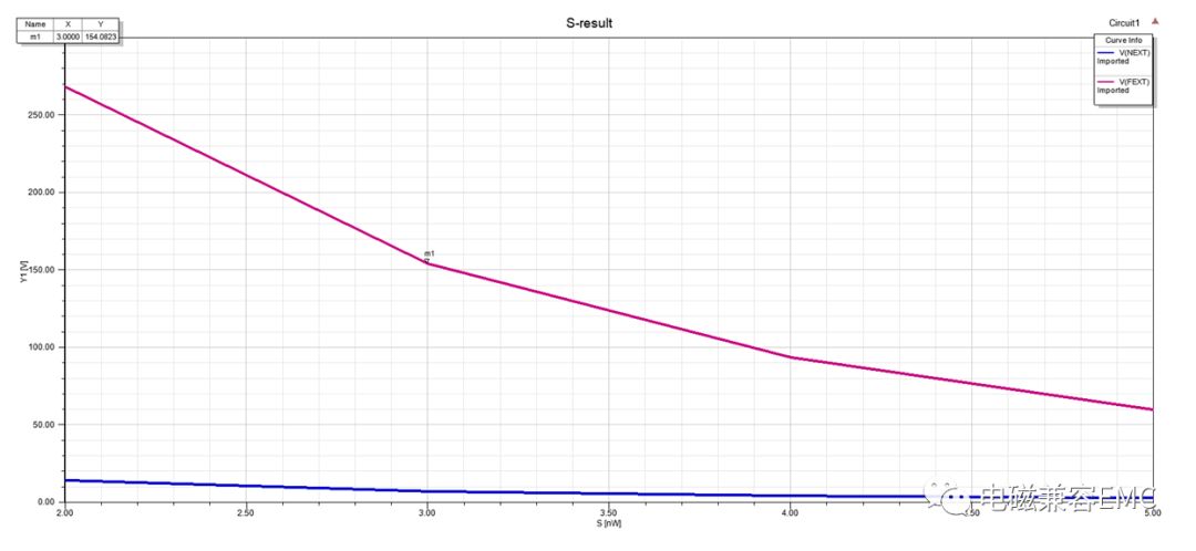 在第二节中,仿真模型默认间距S为1mm,线宽W为0.25mm,这里我们调节线间距S,以0.25mm为倍数,S的值从1W增加到5W,查看受扰线上NEXT和FEXT串扰幅值的变化规律。从图6和图7和图8中可以看出,随着间距增加,NEXT和FEXT端串扰电压幅值先是快速下降,随着S继续增加,下降趋势放缓。