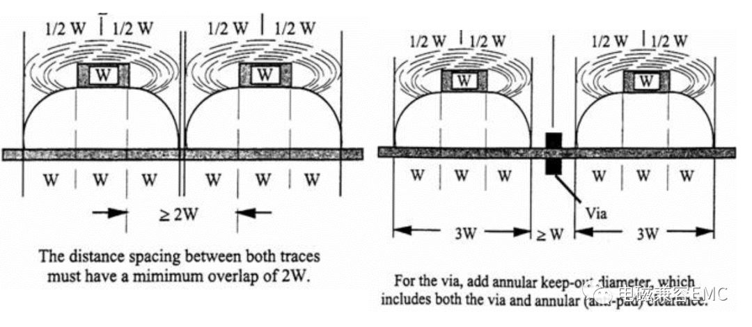 下面是Montrose 在《Printed Circuit Board Design Techniquesfor EMCCompliance》一书中对3W原则的描写