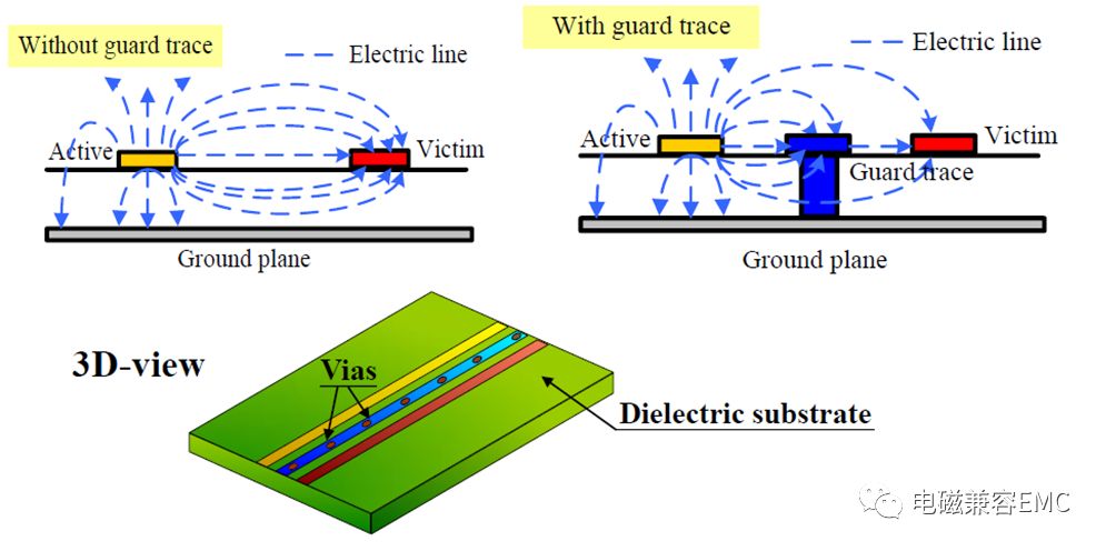 李丽平等在《防护线减小微带线间串扰的FDTD分析》一文中提出,只要:(1)添加有接地过孔的防护线并使过孔间距小于信号在Tr/2(Tr:传输信号的上升时间)时段内的传输距离;(2)在满足线间距布线规则的前提下,将防护线适当加宽而又维持三条线(防护线和两条微带线)中两两之间的中心距不变,就能有效减小线间的远端和近端串扰。