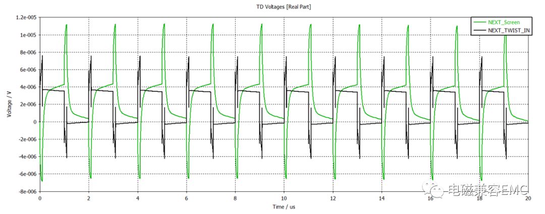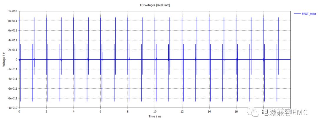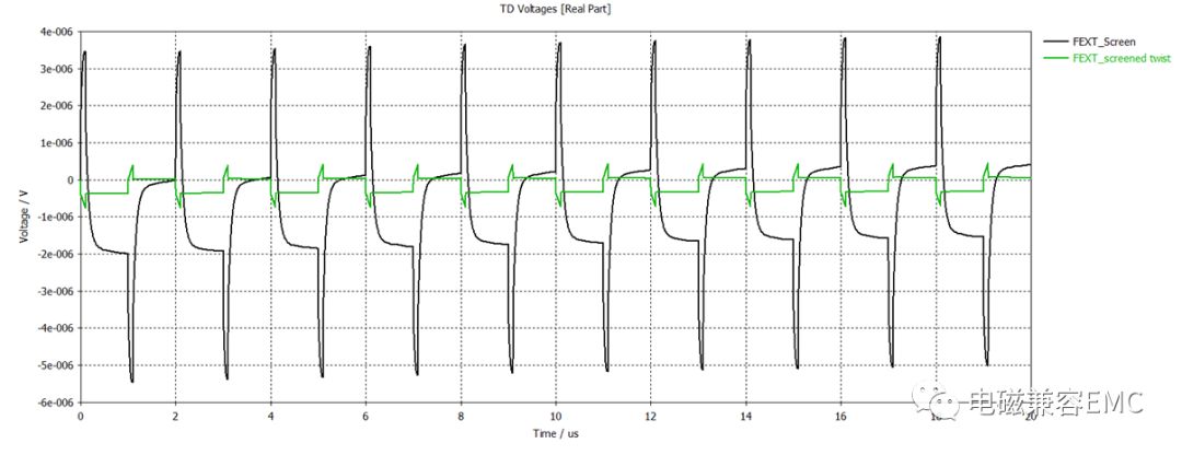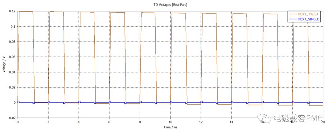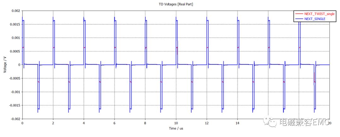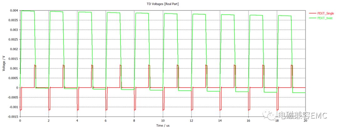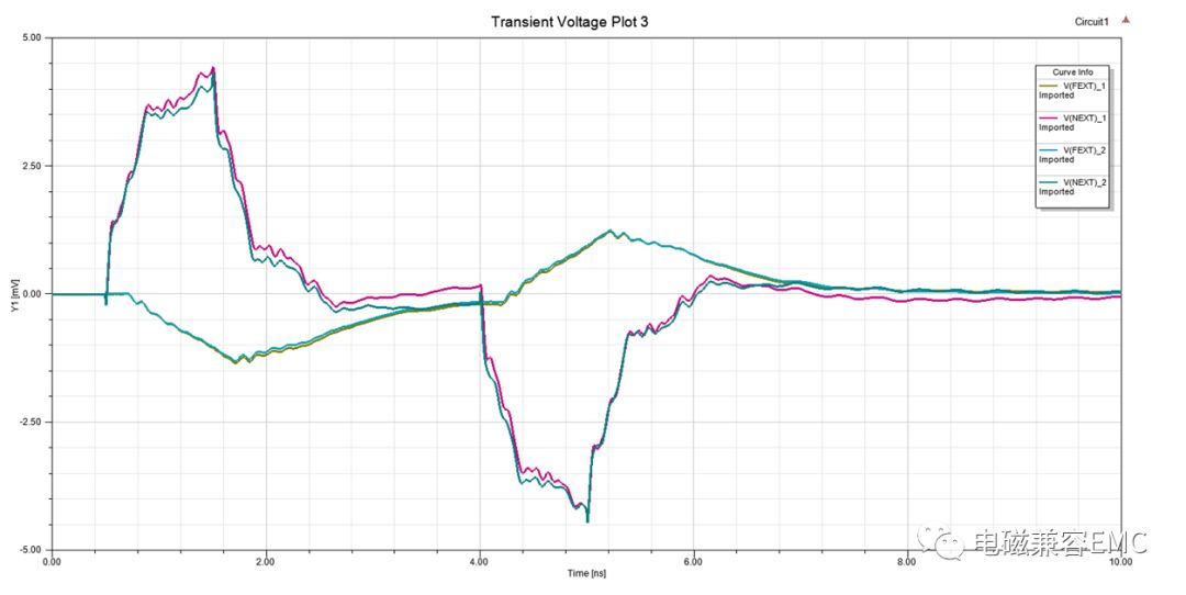 仿真完成后,查看各线束上噪声电压幅值,选择FEXT结果,可以看到相邻线束上噪声电压波形分别如下(数值差距太大,分别进行对比),可以看出,单线和双绞线上的串扰噪声远高于同轴线和屏蔽双绞线,而双绞线上噪声电平最高。多数工程师在产品设计中将线束双绞,这里可以看出双绞做法未必总是有利的,它并不会降低线束上的共模噪声,反而会增加噪声幅值。由互易定理可知,易耦合噪声的线束反过来也容易干扰其它线束,所以对于那些由于设计需要不得不双绞的线束(如非屏蔽网线,视频线,CAN线等),需要与其它线束保持距离(或者直接屏蔽),具体间距可以参考9.1节的结果。