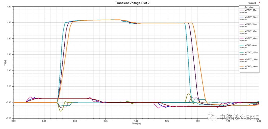 我们将RT时间分别设置为40ps、70ps、100ps,查看victim line上串扰电压幅值的变化,如下图所示。可以看出,上升沿时间的变化,对于近端串扰电平的影响不大,主要影响远端串扰电平。Tr/2大于孔间距的定义是处于对远端串扰防护的设计要求。当Tr时间不变,改变过孔间距的情况会得出相同的结论,感兴趣的读者可以自己去计算一下。