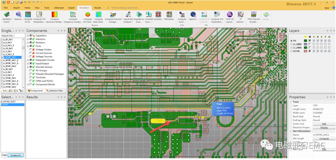 ANSYS SIwave中提供了CrosstalkScan串扰分析模块,分别有时域和频域选项,可对单线/差分线进行串扰的快速分析,图33中以某PCB为例,图中箭头位置为U1的晶振X2,时钟走线XTALIN与信号线A_HSYNC_DAC1有一段较长距离的平行走线,需要评估时钟走线对信号线的影响。