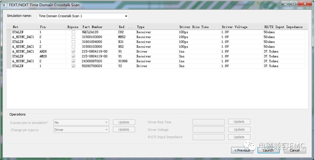 进行仿真前,将精度调制合适水平,crosstalk收敛精度调整为-60db,求解频率调高到20GHz,然后选择Time domain时域仿真,将信号对应的参数填入两根走线的信号定义中,选择launch开始仿真。