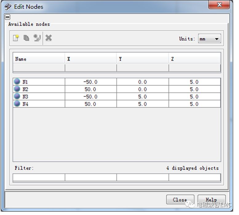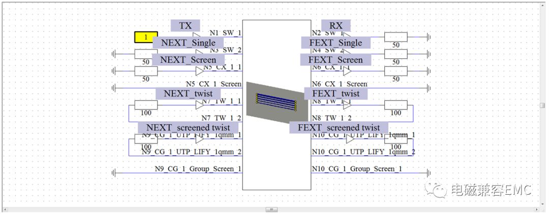 线束长度同样设置为100mm,线束间距为5mm,距离GND平面5mm。线束排列为,最下方施扰线(单线),向上每隔5mm以此是单线、双绞线、同轴线、屏蔽双绞线。提取S参数后的模型如下图所示。