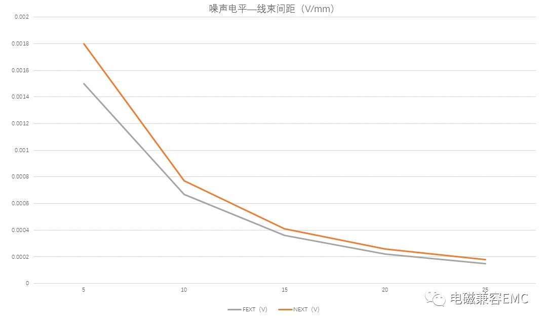 实际上人们在产品设计中往往只关注PCB中上信号走线,忽略线束设计。线束实际上是PCB的延伸,同样需要在布局上重视。当增加线束间距D,观察串扰幅值的变化,如下图所示,当间距D增加到15mm时(3倍h),噪声电平下降趋于平缓。因此,对于敏感信号,需要严格控制线束的走线,必要时需采用独立走线的方式。
