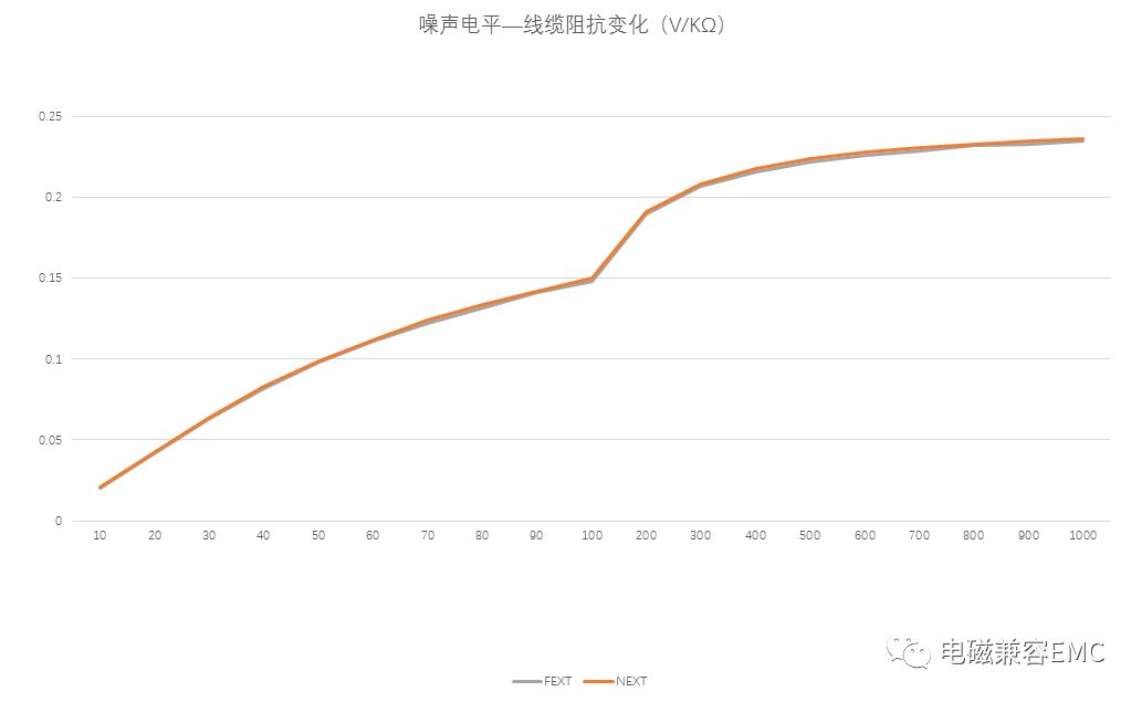 那么,实际中这样的线束设计是否一定满足需求呢?答案是否定的,因为实际电路中信号线阻抗往往是高阻的,尤其是采样信号线束的阻抗通常在千Ω以上,当受扰线阻抗增加到1MΩ时,线上噪声电平将增加到不能接受的水平。如下图结果中,FEXT,和NEXT电平增加到0.18V,现实产品中往往将线束扎起来(D减小),并且有较长的走线(如EMC测试要求线束长度为2米左右)。这些情况都会增加受扰线上噪声电平,尤其是在做EMS抗扰度测试时,若信号线不做滤波等防护处理,产品是极易被干扰的。对比上下两图,可以看出FEXT与NEXT由开始的反相变为同相,这是为何?这个问题留给读者去思考。