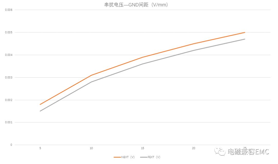 前面公式中可以看到,降低线束与GND平面的距离,可以降低线束间串扰的幅值。这里采用软件计算出随GND间距h变化,串扰幅值变化的情况。从下图结果中可以看出,随着线束与GND间距增加,串扰幅值增加,在设计允许的间距范围内,整个趋势近似为线性增加。也就是说,当h减小一倍,受扰线上噪声电平幅值便降低3dB。