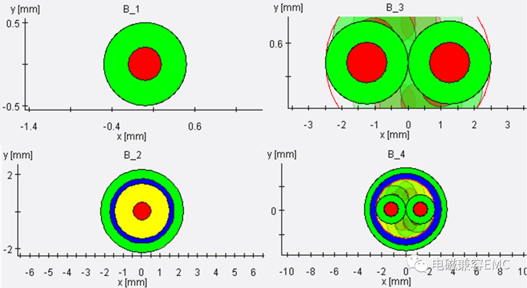 采用CST cable studio分别建立单线,双绞线,同轴线和屏蔽双绞线模型,如下图所示。
