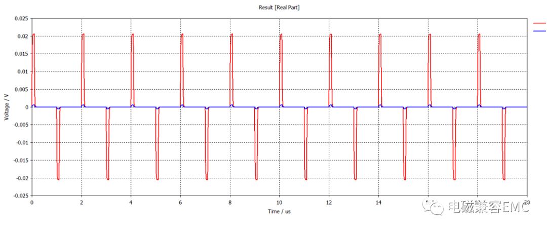 查看victim line上近端和远端波形,如下图所示,受扰线上电压幅值约为施扰线电平的2%。即使施扰线信号电平增加到3.3V或者5V(多数信号电平),受扰线上噪声电平也是可以接受的。