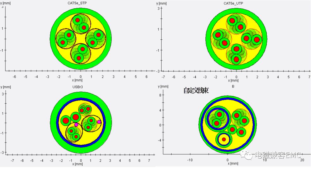 实际产品设计中,我们会遇到各种类型的线束,如CAT5E_STP(超五类屏蔽线),CAT5E_UTP(超五类非屏蔽线),USBr3(USB3.0高速数据线)等等,并且线束厂家会满足客户对于线束设计的要求。那么,如此多种类的线束应该如何去设计呢?下图最后一张为自定义线束,与9.2节相同,一根大的屏蔽线束内包含了单线、双绞、同轴、屏蔽双绞等常见的线型。