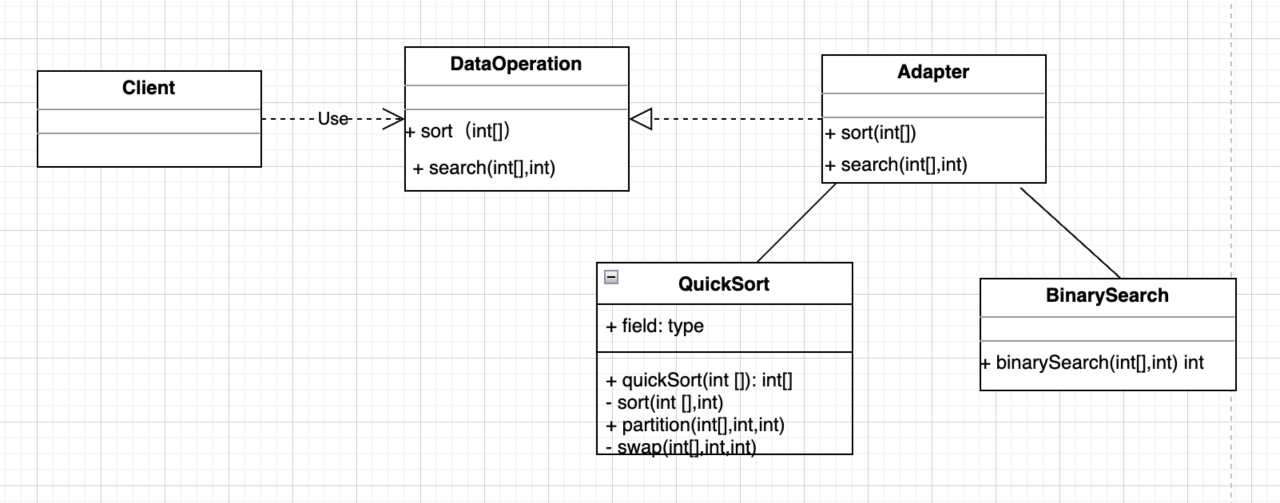 题目:现有一个接口DataOperation定义了排序方法sort(int[]) 和查找方法search(int[], int),已知类QuickSort的quickSort(int[])方法实现了快速排序算法,类BinarySearch 的binarySearch(int[], int)方法实现了二分查找算法。现使用适配器模式设计一个系统,在不修改源代码的情况下将类QuickSort和类BinarySearch的方法适配到DataOperation接口中。绘制类图并编程实现。 (要求实现快速排序和二分查找)。