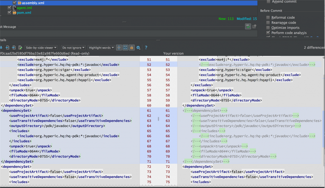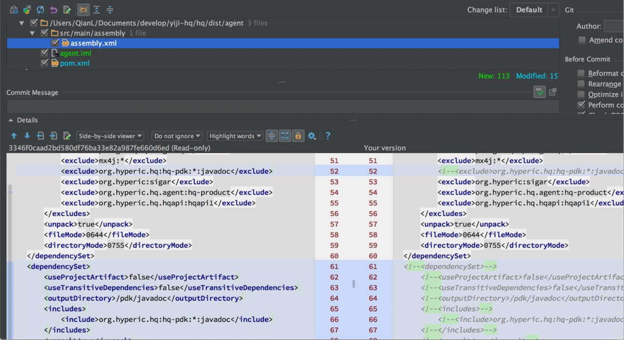 - 因为上面不编译javadoc的缘故,所以在项目agent中,要把对hq-pdk项目的javadoc的依赖给去掉,不然这个项目也会编译失败,我把改后的文件对比放上来: