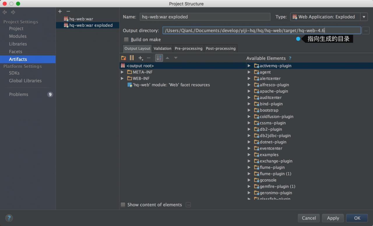- 打开IDEA的项目配置界面,切换到Artifacts界面,新建一个hq-web项目的Web Application:Exploded。并将output directory目录指向上面生成的目录。如:
