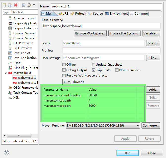 org.apache.tomcat.maven:tomcat6-maven-plugin:2.2:run -Dmaven.tomcat.uriEncoding=UTF-8配置二选一,Tomcat7运 行: