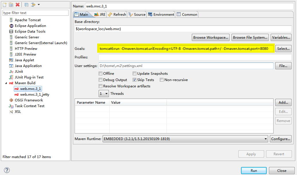 使用Eclipse的Maven Build运行,Goals配置,如图: