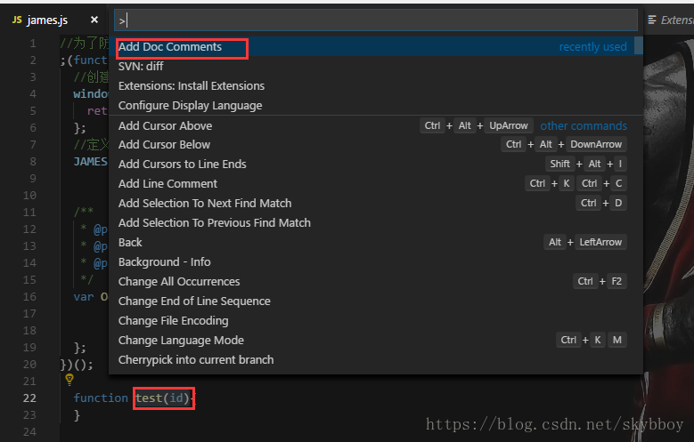 1.在vscode中搜索插件 add jsdoc comments 安装,安装成功后重启,选中方法(方法名+括号参数),然后按下F1,选中命令Add Doc Comments 即可。不过这个插件支持的注释很少。