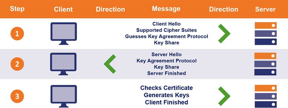 第1步:与TLS 1.2握手类似,TLS 1.3握手从“客户问候”消息开始。客户端发送支持的密码套件列表并猜测服务器可能选择的密钥协议协议。客户端还发送其特定密钥协议。