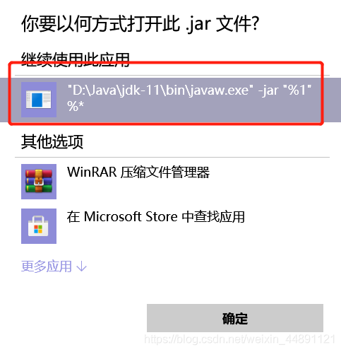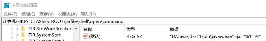 开始——regedit.exe——HKEY_CLASSES_ROOT\jarfile\shell\open\command——默认(左击)——右键(修改)——"D:\java\jdk\bin\javaw.exe" -jar "%1" %*(自己当前的目录名)