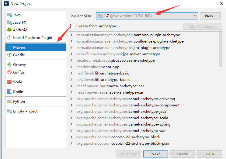 打开idea,点击File—New—Project,弹出如下界面,选择Maven项目,查看是否是正确的JDK配置项正常来说这一栏会自动填充的(如果这里没有正常显示JDK的话,可以点击右侧的New…按钮,然后指定JDK安装路径的根目录即可)。在界面上也提供了"create from archetype"一些现成的模板,此处我们不使用模板,所以不勾选。点击Next。