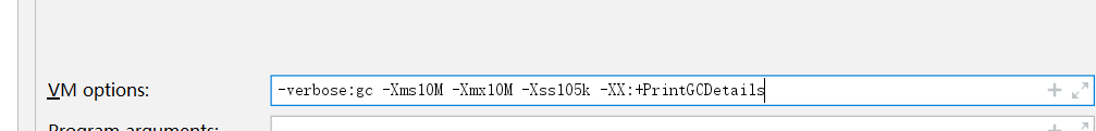 //-verbose:gc -Xms10M -Xmx10M -Xss105k -XX:+PrintGCDetails