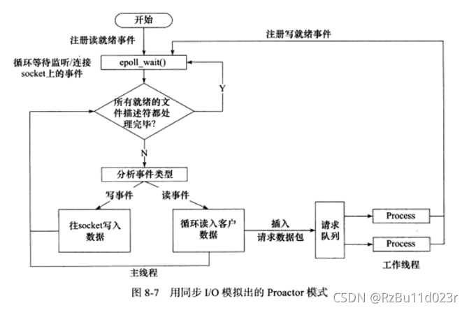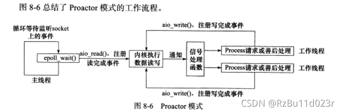 而 Proactor 就是说让 worker 只进行业务逻辑,所有 IO 都通过主线程调用异步 IO 或者直接调用异步 IO 实现,主线程(进程)只需要 epoll listen descriptor(因为已连接的 d 委托给了异步 IO,自然就不需要阻塞了)。我认为为了更好地理解 Proactor,应该先看下面的同步模拟 Proactor(IO 全部在 master 上)。其实就是说让 kernel 的 asynchronous IO 来管理所有的阻塞事件,要读东西可能阻塞怎么办?让内核读完了再递交上来! 要写东西可能阻塞怎么办?让内核写完了再通知上来!(然而对于 listen d 我们必须要 accept 他才能进行 r/w ,所以这个必须要让 master 线程来阻塞等待!)