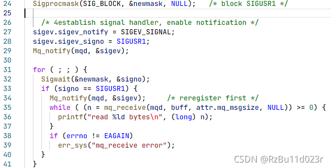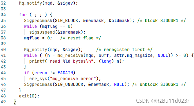 - 结果他跟我说可以思想升级,直接用 sigwait 而不用设置什么信号 bit 和 suspend 前判断 bit。sigwait 不用 handler,直接等信号发生就返回。(sigwait 调用前先 sigprocmask block 先)。这个太重要了,代码必须贴一份(首先 mark 一下路径 pxmsg/mqnotifysig4.c)