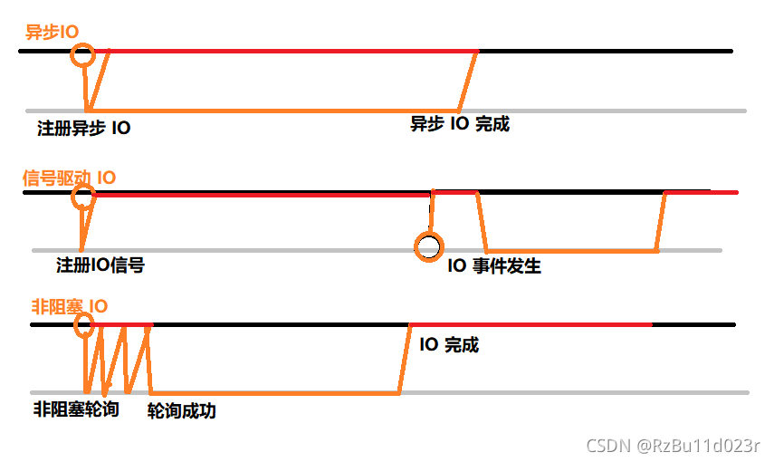 - 直接看这个图(用 windows 画图画的,,)好了(我认为这个应该很清楚了,如果有错误欢迎指出!),红色是上层计算工作,橙色是 IO 操作,黑色是用户态进程上下文,灰色是 kernel 上下文。(异步 IO 可能画得不好,kernel 可能会等一段时间才变橙色,或者 kernel 线可能是另一个 background process 的实现也行)