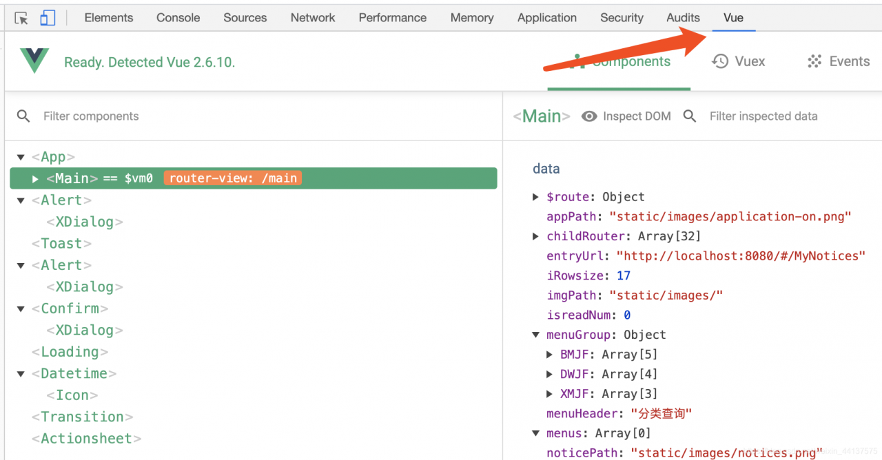 6. 启动 Vue 项目后,f12 在控制台中即会出现 vue 一栏,选中 vue 就可使用了