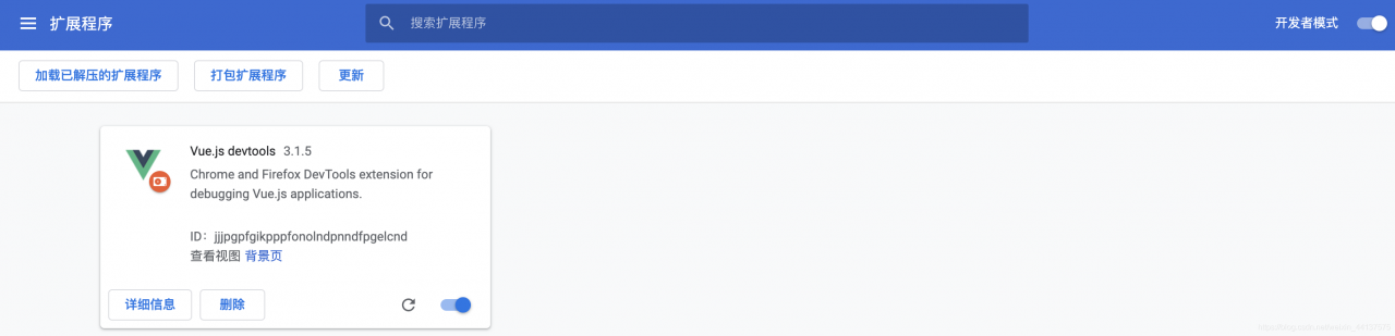 打开 Chrome 浏览器,点击 三个点-更多工具-扩展程序-开发者模式-加载已解压的扩展程序- vue-devtools>packages>shell-chrome 放入