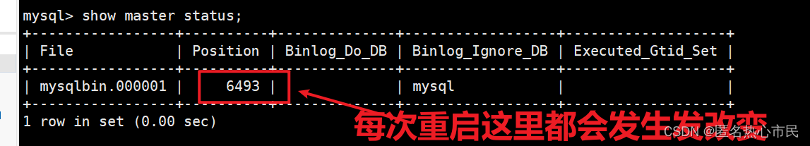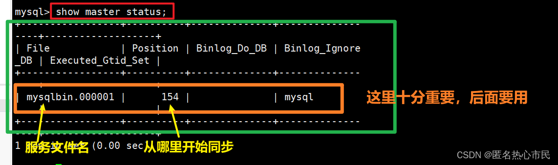File : 从哪个日志文件开始推送日志文件 给从节点 Position : 从哪个位置开始推送日志 从什么位置开始同步 Binlog_Ignore_DB : 指定不需要同步的数据库